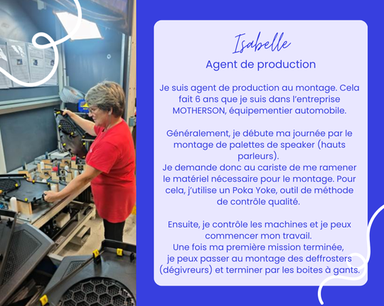 Isabelle est agent de production au montage depuis six ans au sein de l’entreprise MOTHERSON, équipementier automobile. Elle est salariée en CDI d’Alliance Emploi et mise à disposition sur le site industriel.